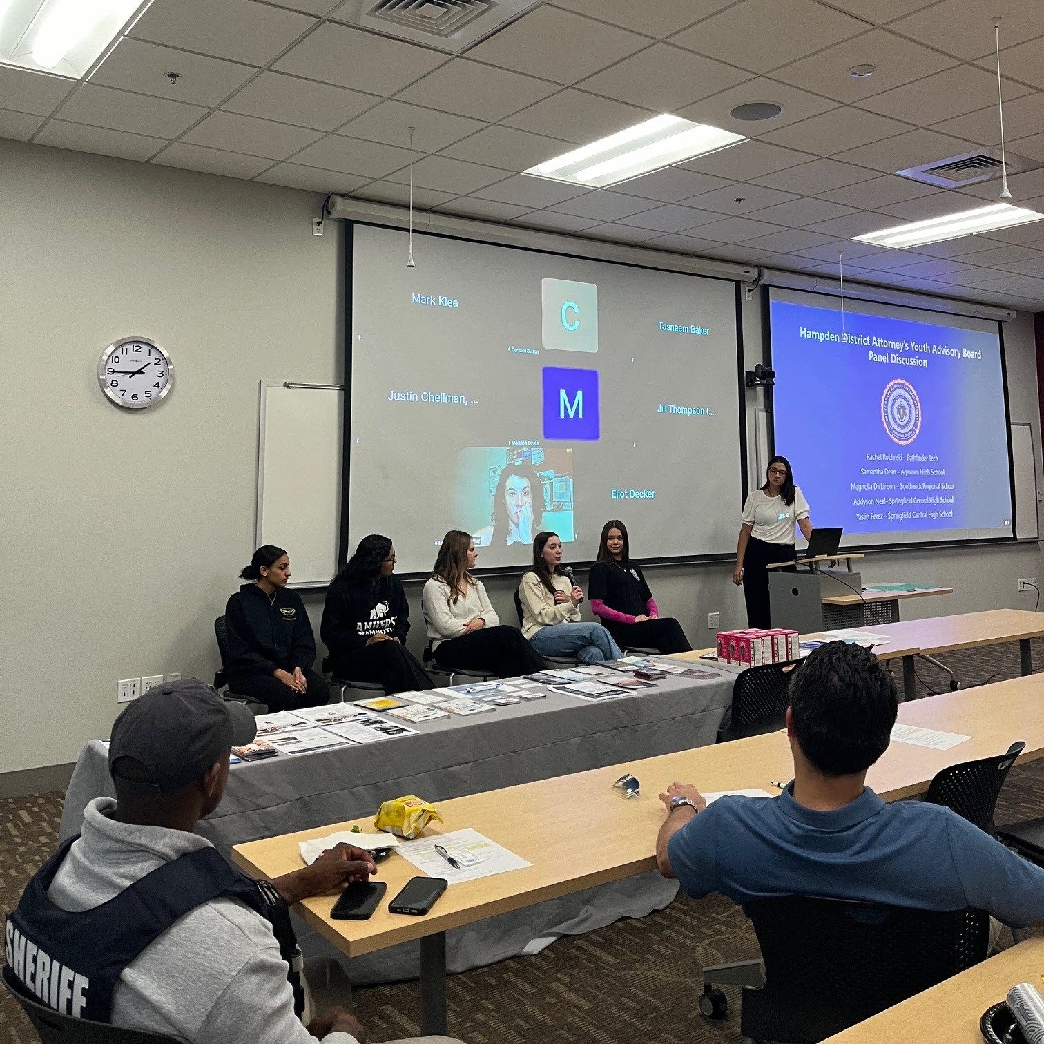 The meeting also featured a powerful panel discussion with members of the Hampden District Attorney’s Youth Advisory Board, led by Deputy Director Gina Anselmo of the District Attorney’s Community Safety and Outreach Unit. Five high school students from across the county, Magnolia Dickinson, Samantha Dean, Rachel Roblinski, Addyson Neal, and Yaslin Perez, shared insights on the challenges their peers face, including mental health struggles, peer pressure, and the influence of social media on substance use.
